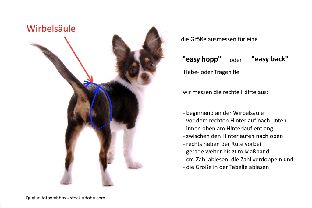 Optional zum Anheben der Hinterbeine (um ein Absinken zu verhindern) kann das Tragegeschirr mit der zusätzlichen Hebehilfe easy back ergänzt werden.